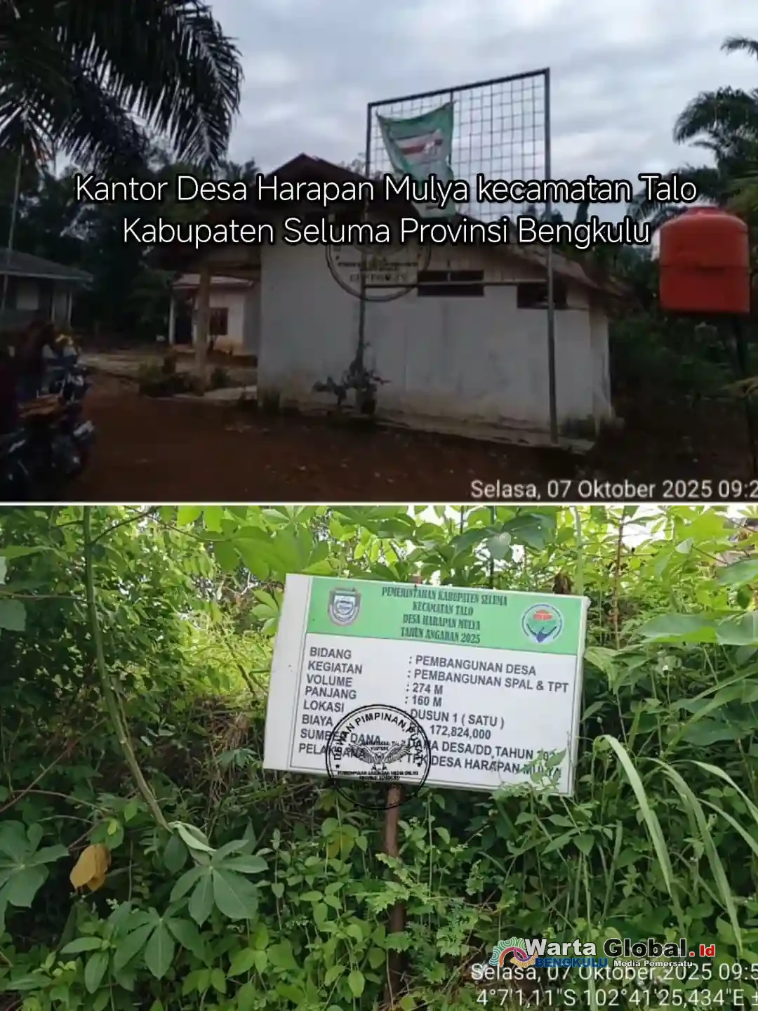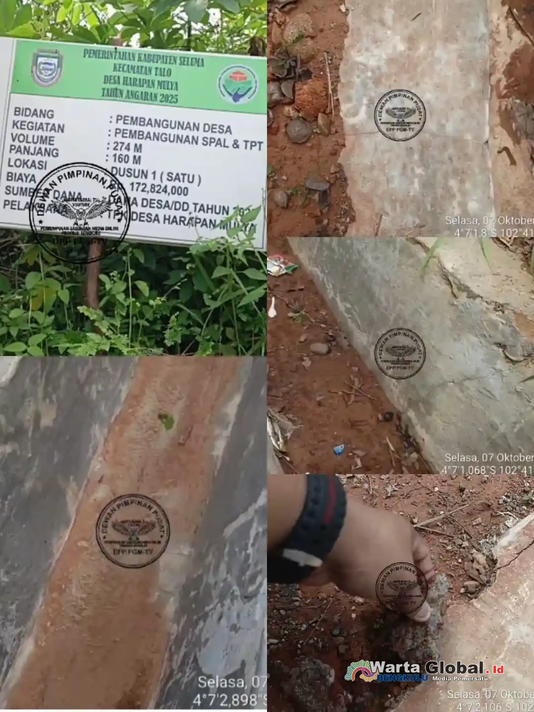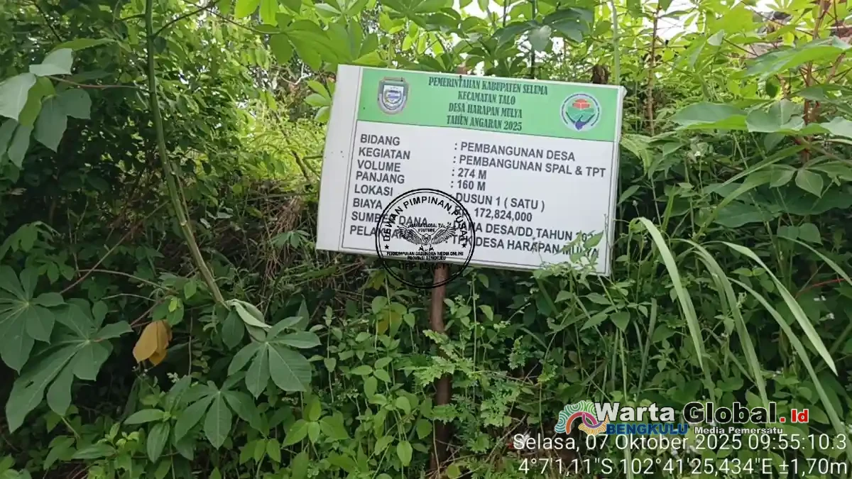 Desa Harapan Mulya, Bengkulu.wartaglobal.id Proyek pembangunan Saluran Pembuangan Air Limbah (SPAL) dan TPT,dengan Volume 274 meter,Panjang 160 meter, lokasi Dusun 1 ,dengan biaya Rp. 172.824.000 (Seratus tujuh puluh dua juta delapan ratus dua puluh empat ribu),di Lapangan Desa Harapan mulya yang bersumber dari APBDES Tahun anggaran 2025 di Desa Harapan Mulya, Kecamatan Talo, Kabupaten Seluma, menuai sorotan warga. Pasalnya, bangunan tersebut diduga tidak sesuai spesifikasi, khususnya dari sisi ketinggian saluran. Selain itu, kondisi fisik bangunan tersebut sudah mengalami kerusakan hanya dalam waktu 3 bulan setelah selesai dikerjakan dan Serah Terima.