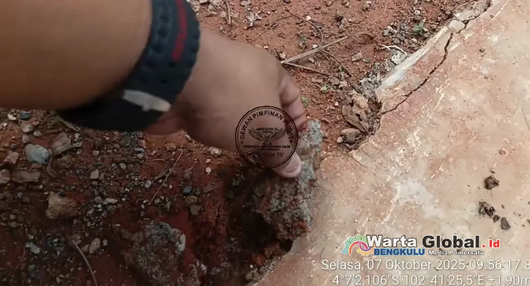 “Baru 3 bulan serah Terima selesai Pak, sudah banyak semennya yang retak, pecah,dan tidak rata dan mengelupas. Ini bikin kami curiga dengan kualitas pengerjaannya,” ujar Johan Sebagai Pengawas Umum PGM-TV YouTube dan Online Provinsi Bengkulu.Selasa, 7 Oktober 2025.