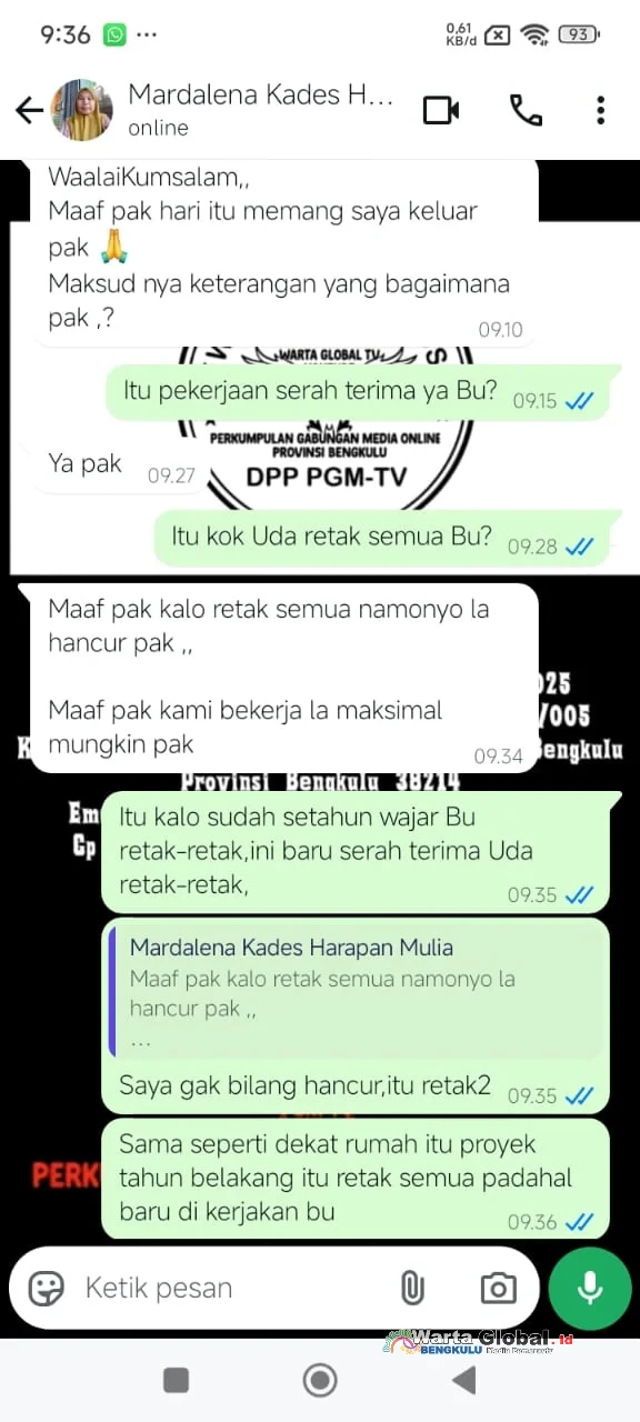 - "Maaf pak kalo retak semua namanya la hancur pak ,, maaf pak kami la kerja maksimal mungkin pak" Balas Whatsapp ibu Mahdalena kades harapan Mulya."
